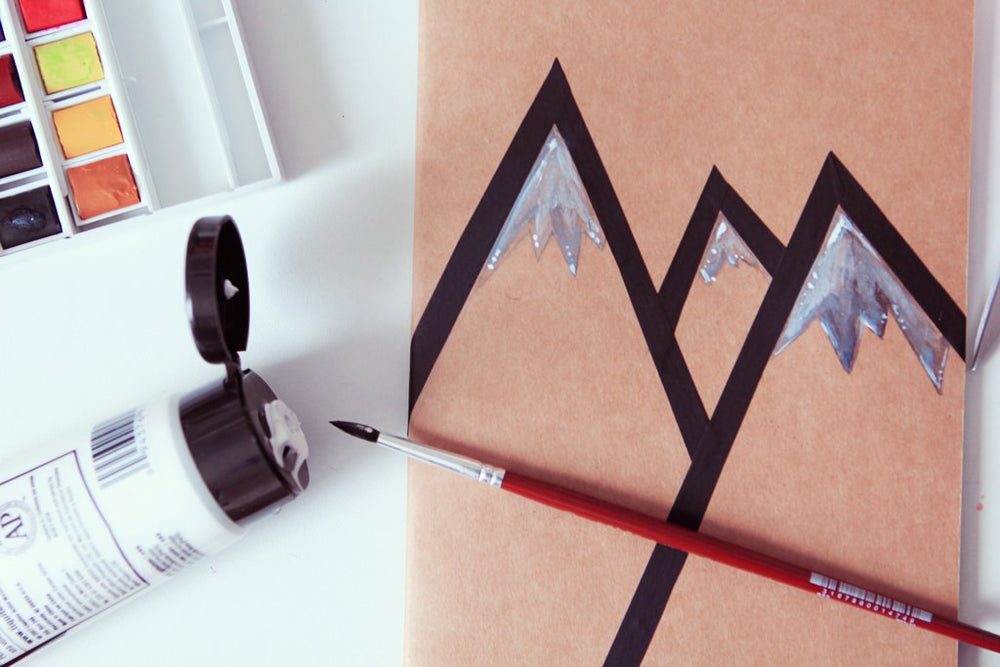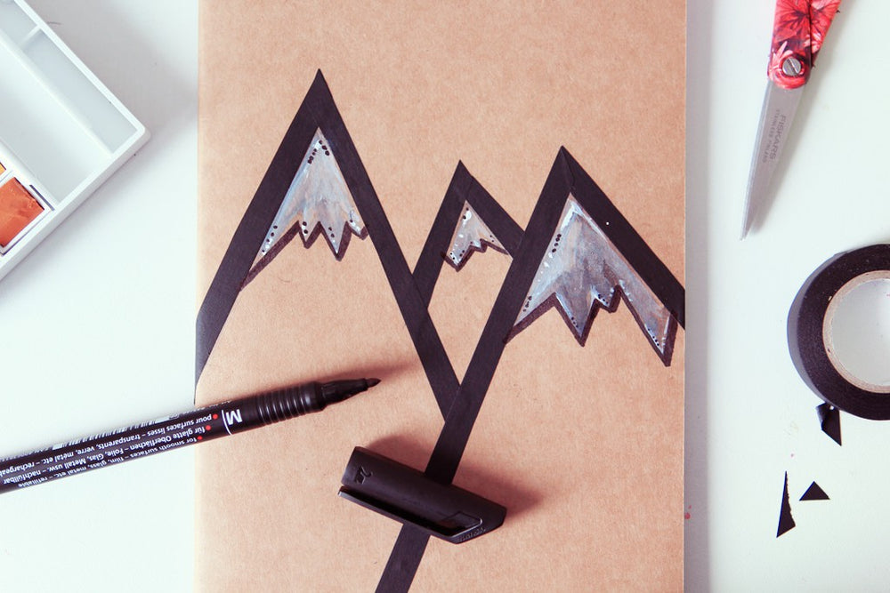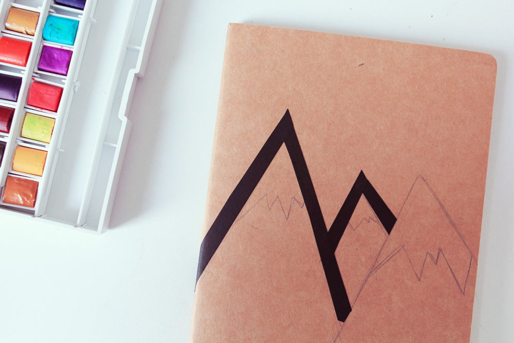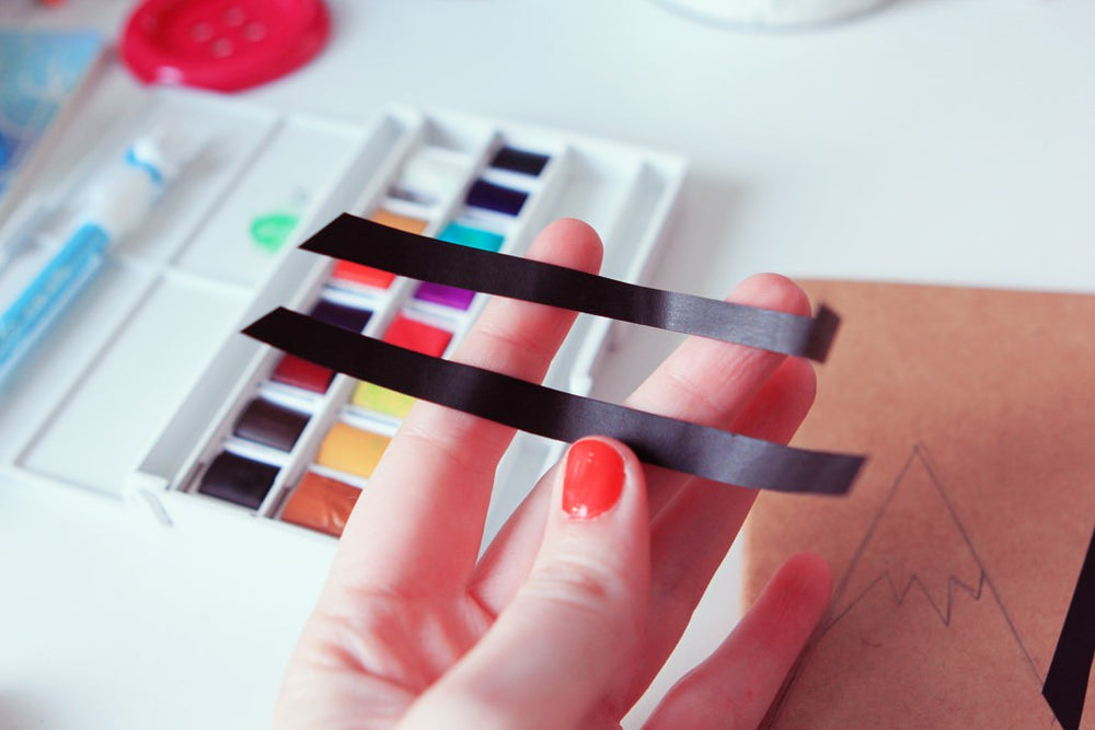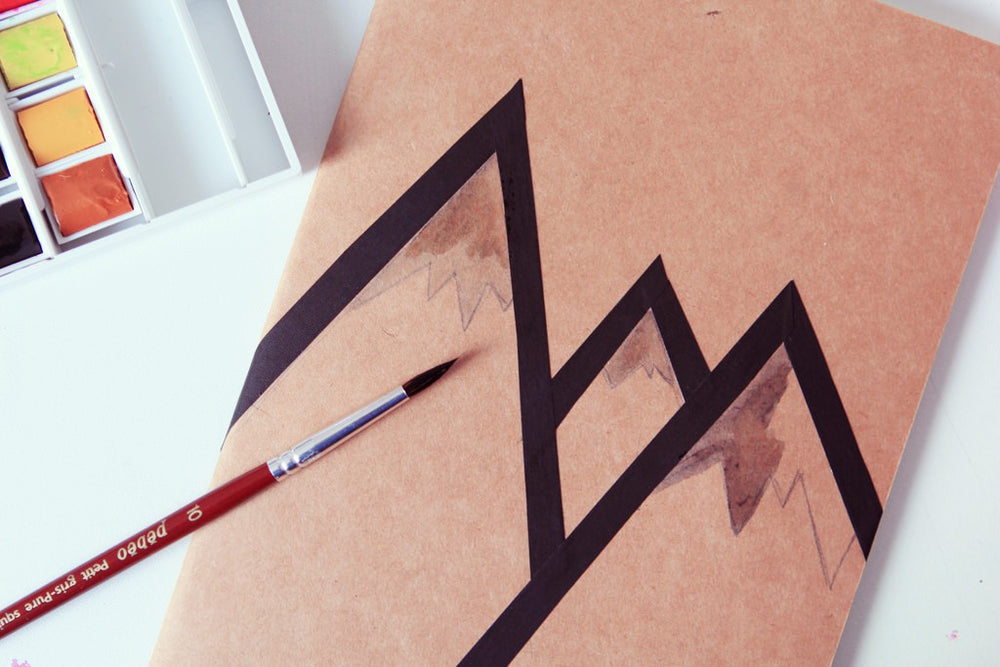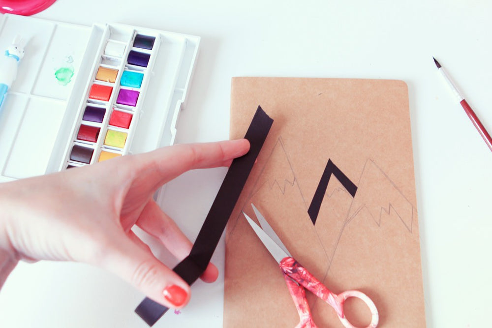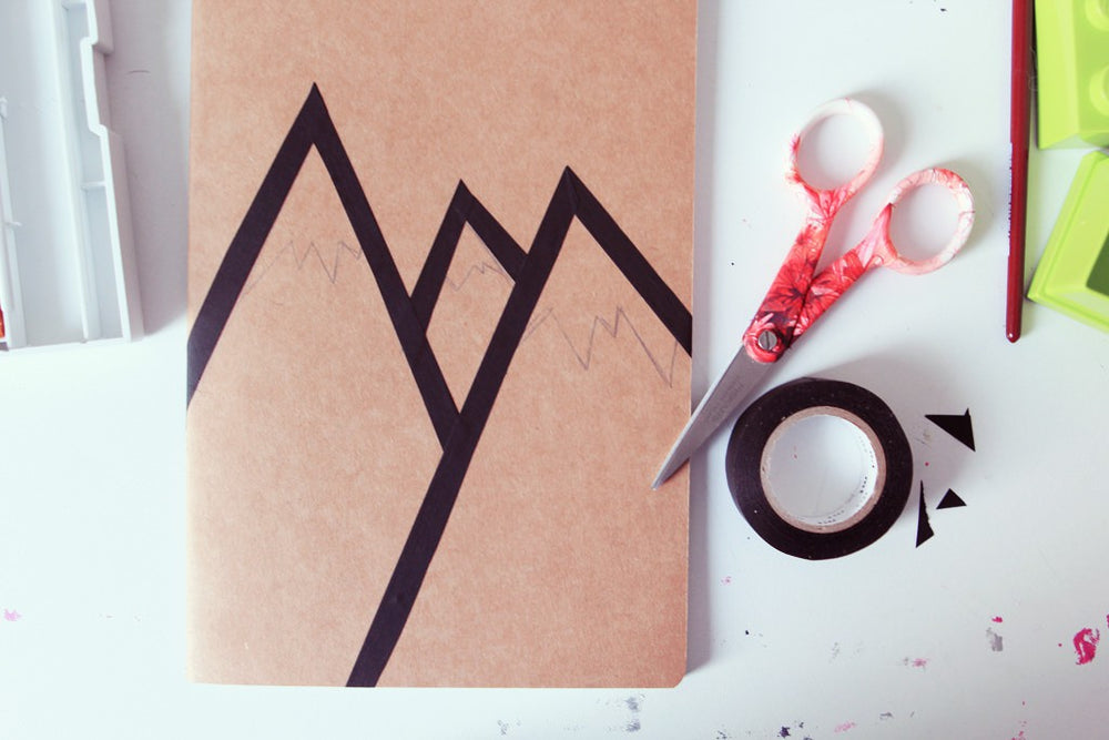 Dessinez des montagnes au crayon de papier sur le carnet et coupez du masking tape à la bonne longueur