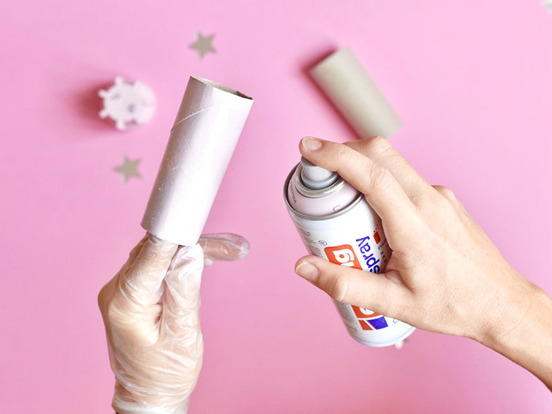 Bombez vos 24 rouleaux de papier toilette avec le spray Edding. Pensez à vous protéger (mains, vêtements et support).