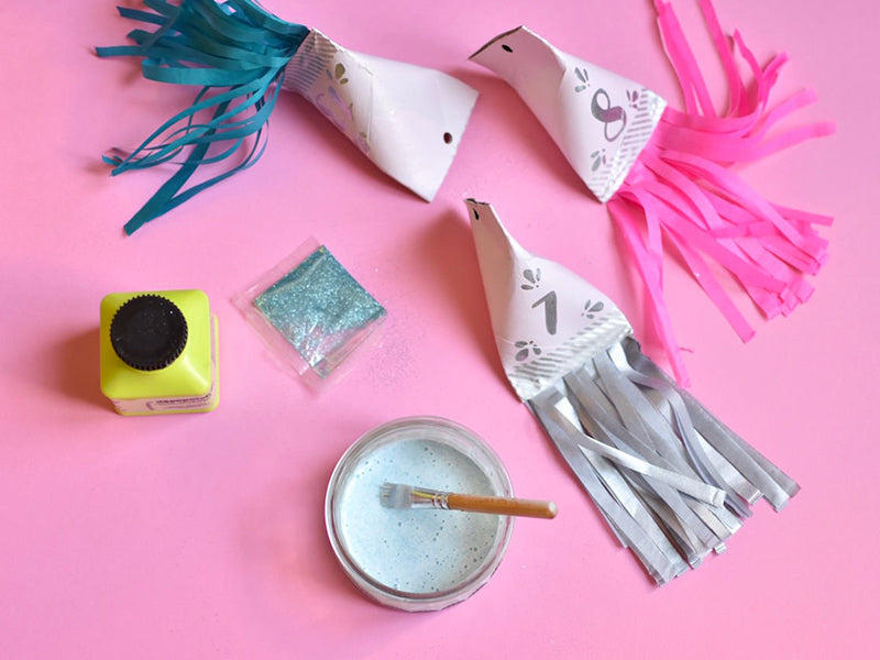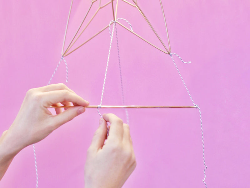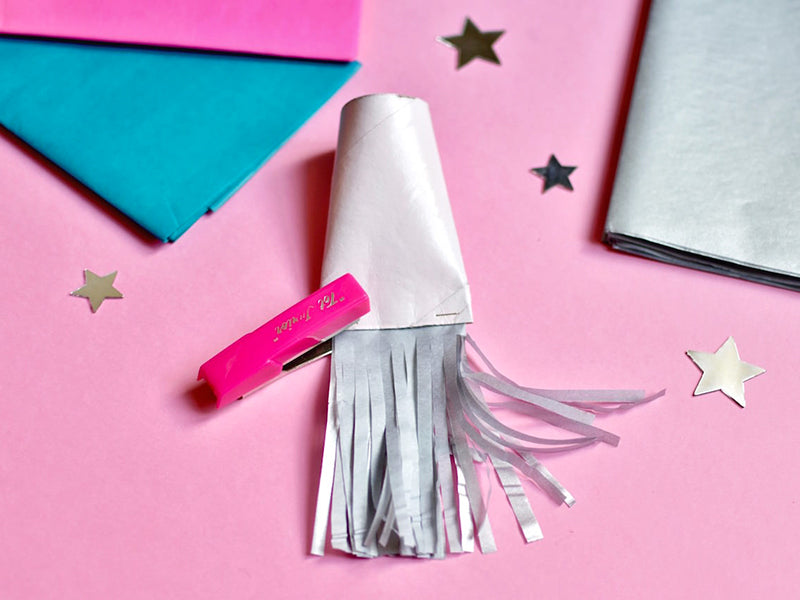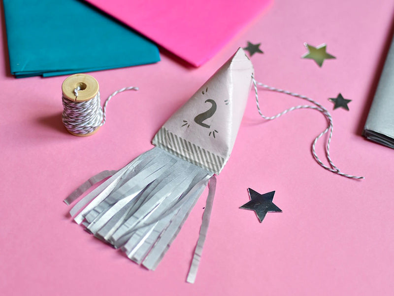 Dans chaque fusée, glissez un morceau de ficelle qui vous servira à les accrocher au support.