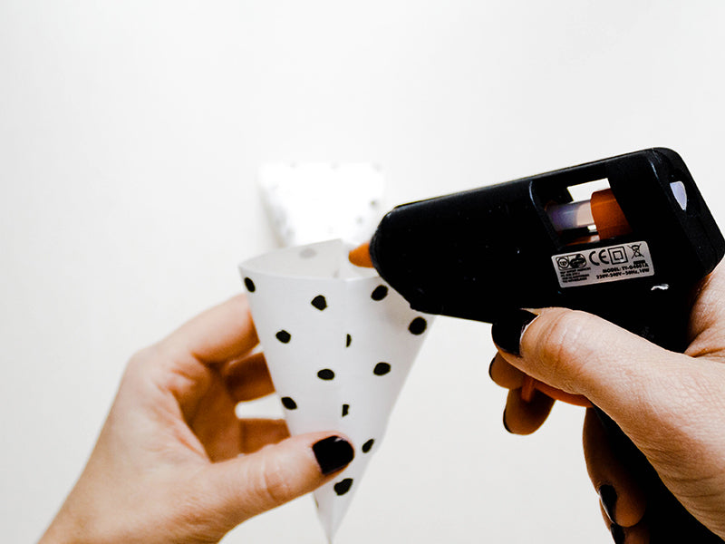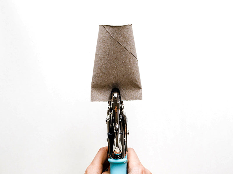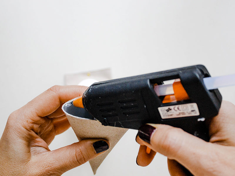Aplatissez le bas du rouleau dans le sens inverse pour former un berlingot puis collez à l'aide sur pistolet à colle pour le refermer.