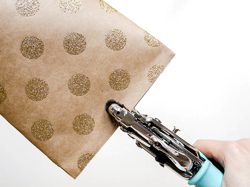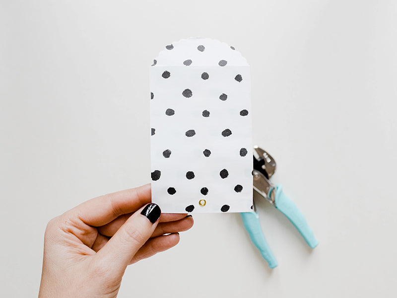 Pour les petites pochettes à pois, faites un trou avec la pince et mettez l'oeillet.