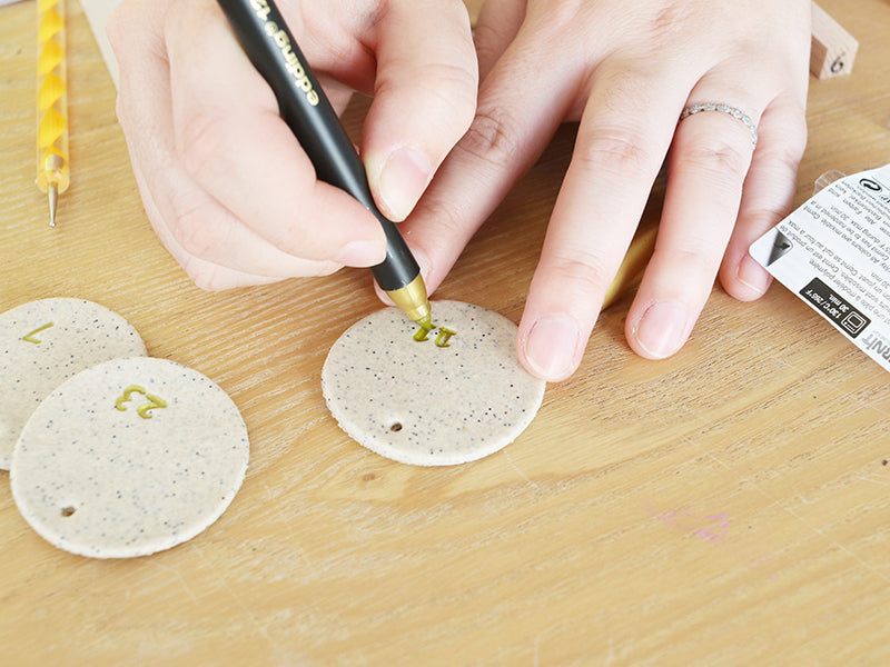 Après avoir fait cuire vos ronds pendant 20 minutes à environ 110°, vous pouvez colorier les chiffres avec un feutre doré Edding.