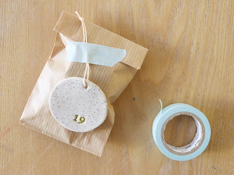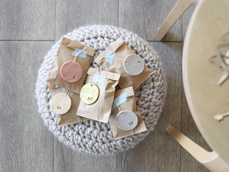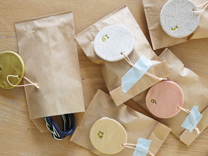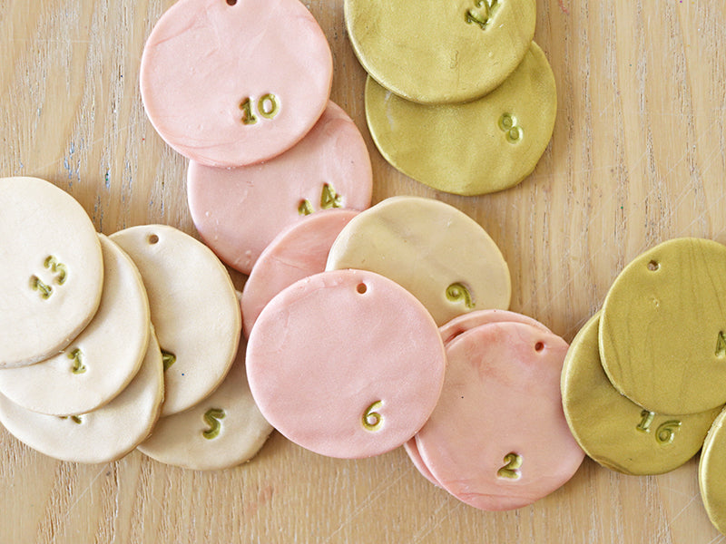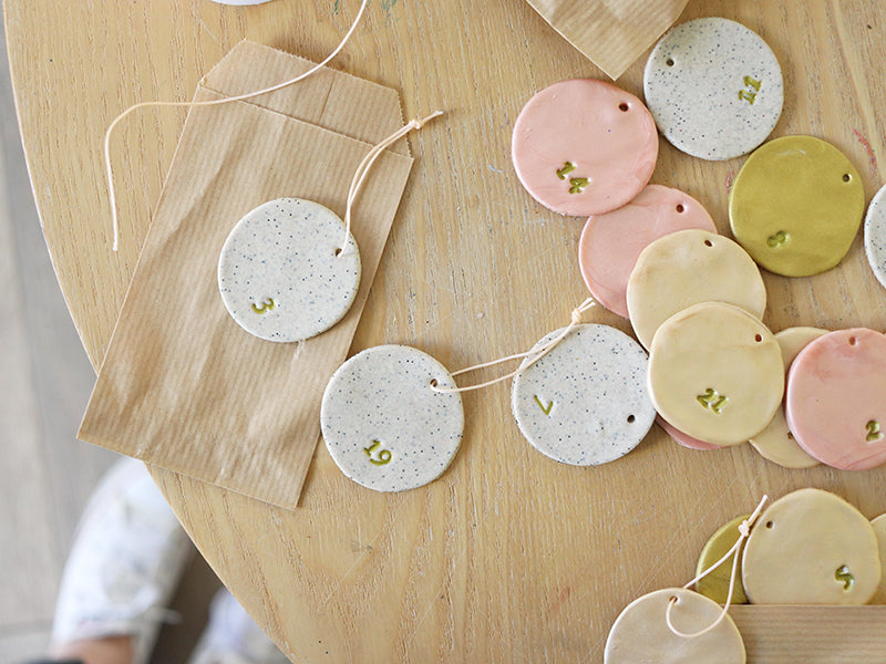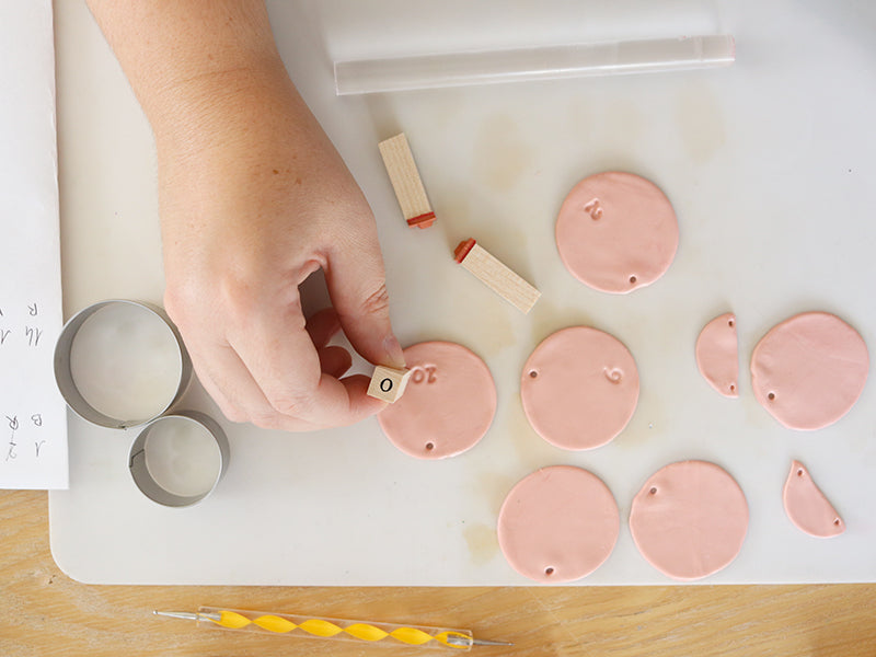 Avec des tampons chiffres, gravez les chiffres de 1 à 24 sur chaque rond en appuyant légèrement sur la pâte.