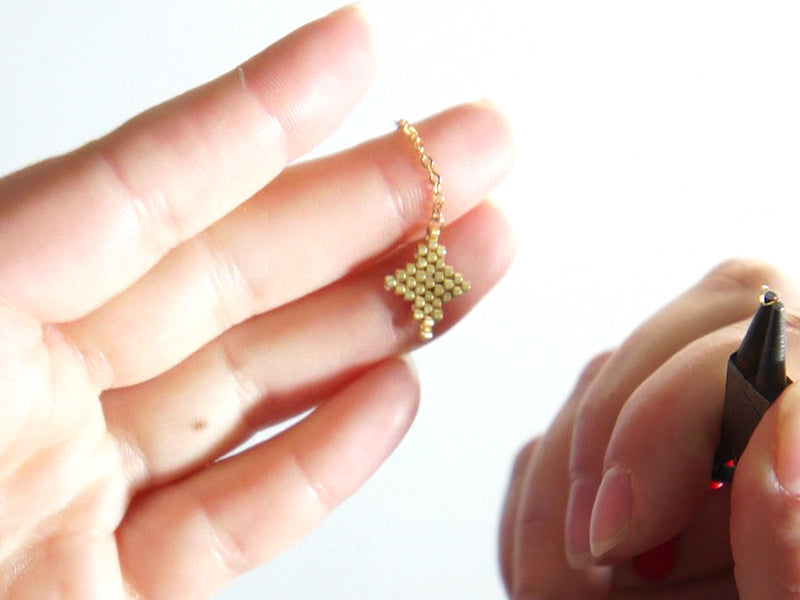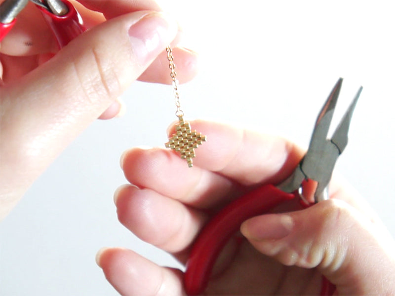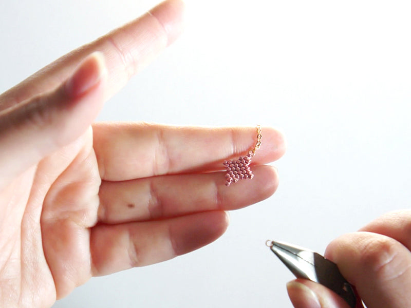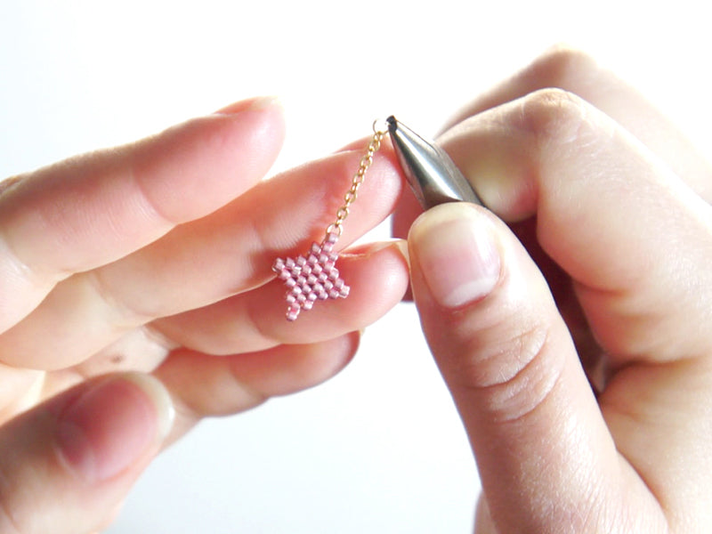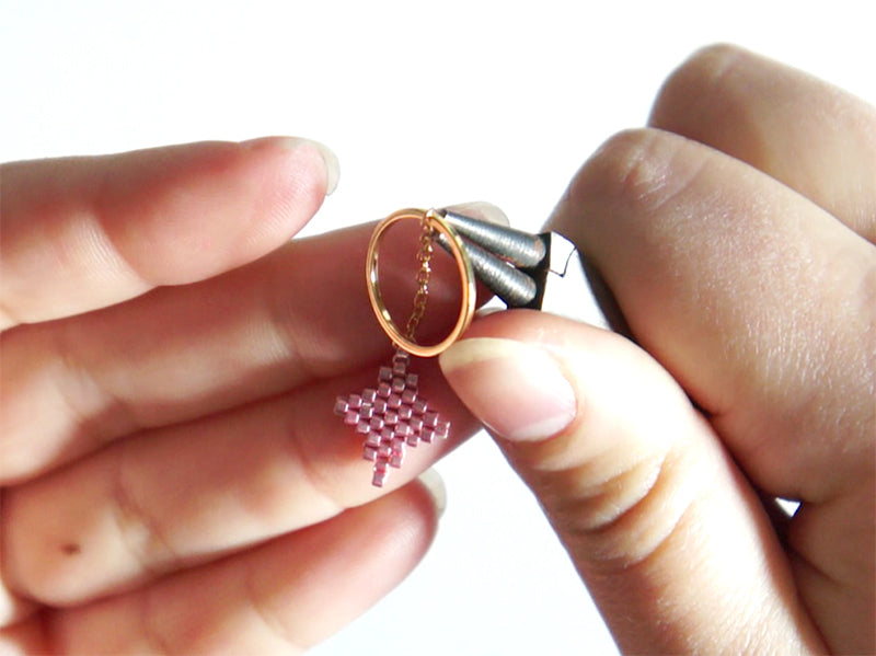 Ouvrez un anneau à l’aide de pinces et glissez-le dans la perle la plus haute du tissage de l’étoile doré