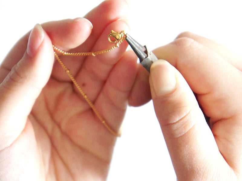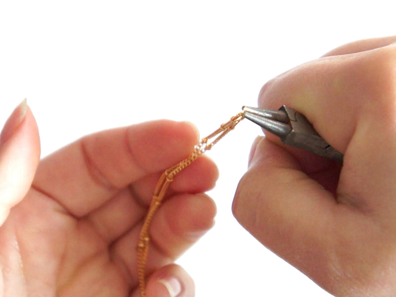 A l’extrémité d’une des deux chaînes gourmette insérez un anneau, glissez-y le fermoir mousqueton puis refermez l’anneau.