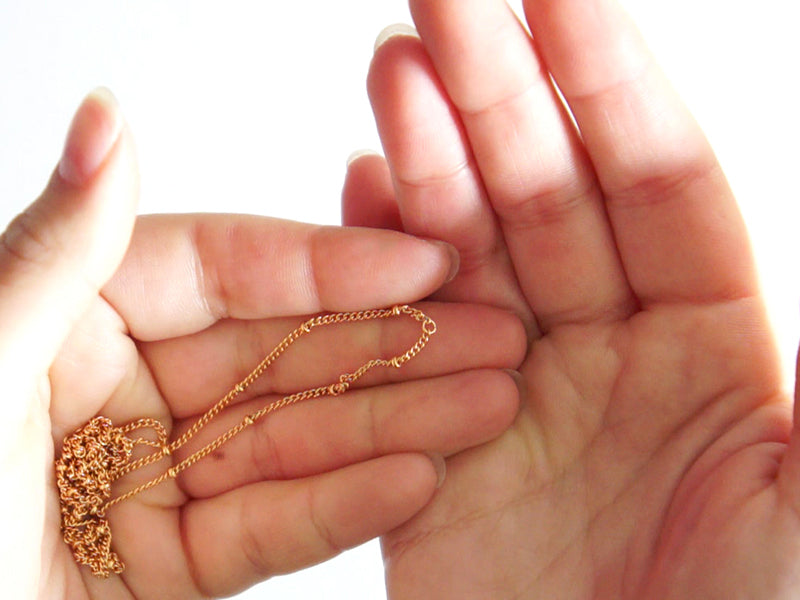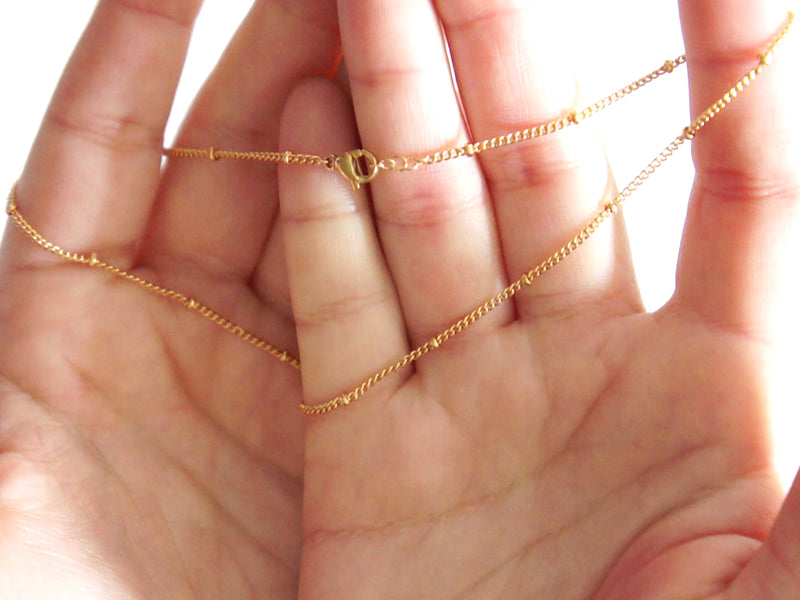 A l’extrémité de la seconde chaîne gourmette, assemblez 5 anneaux doré pour créer une chaînette d’extension, puis refermez-les