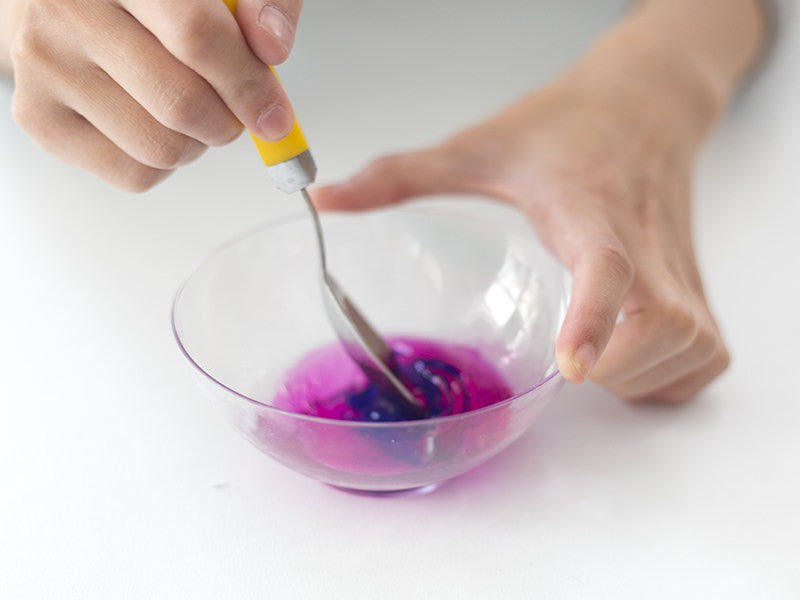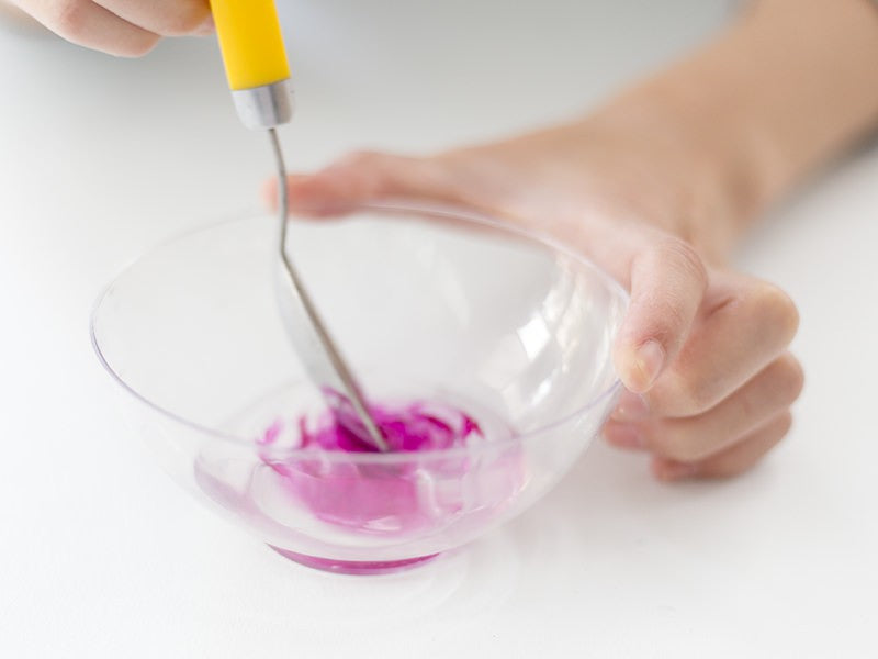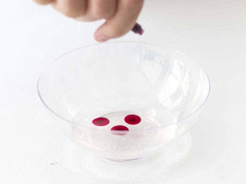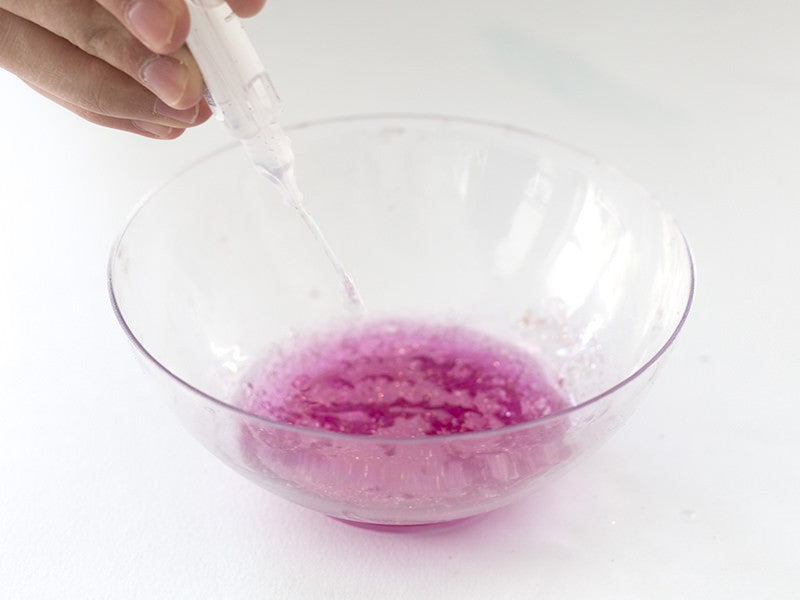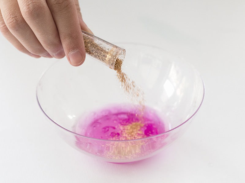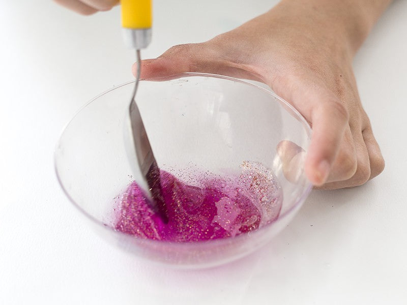 Pour le rose, 2 gouttes d'encre roses suffiront à colorer la colle.