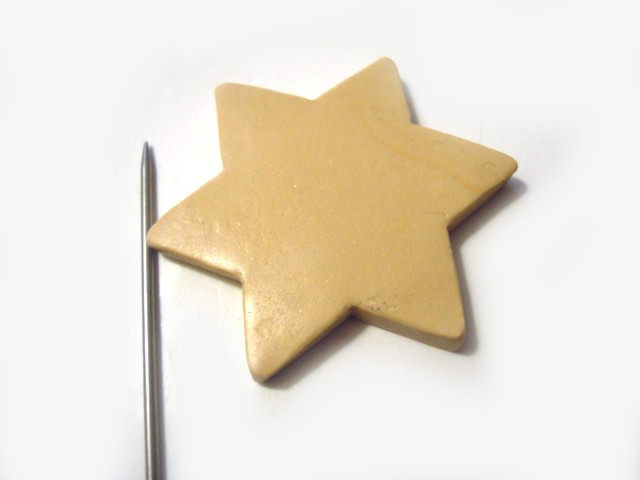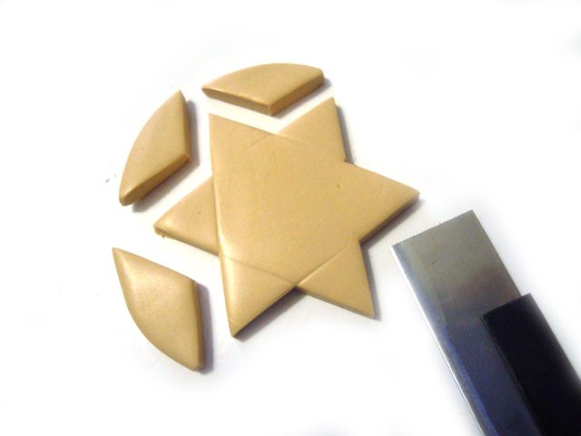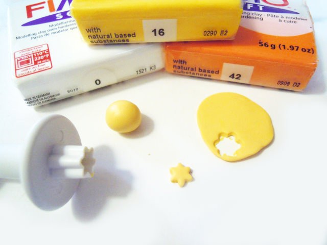 Mélangez de la fimo blanche, mandarine et tournesol et étalez la pâte. Découpez de petites étoiles.