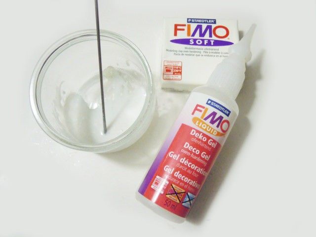 Mélangez de la Fimo liquide et de la Fimo blanche pour faire du coulis et de la "colle" pour monter votre sapin.