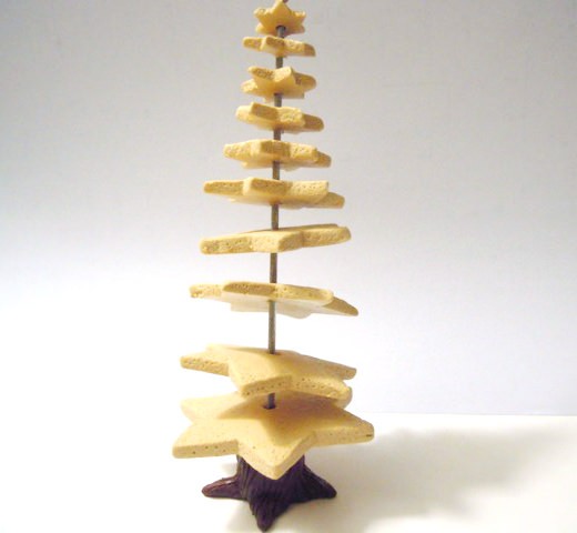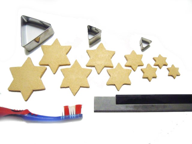 Empilez toutes vos étoiles en les collant entre elles. Placez ensuite toutes vos décorations. Cuire le tout à 110° pendant 20 minutes et vernissez pour protéger le tout.