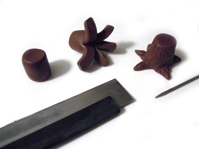 Pour la souche, faites un cylindre dans la fimo "chocolat", taillez 5 "pieds" dans le cylindre et texturez en faisant des lignes verticales pour un effet bois.