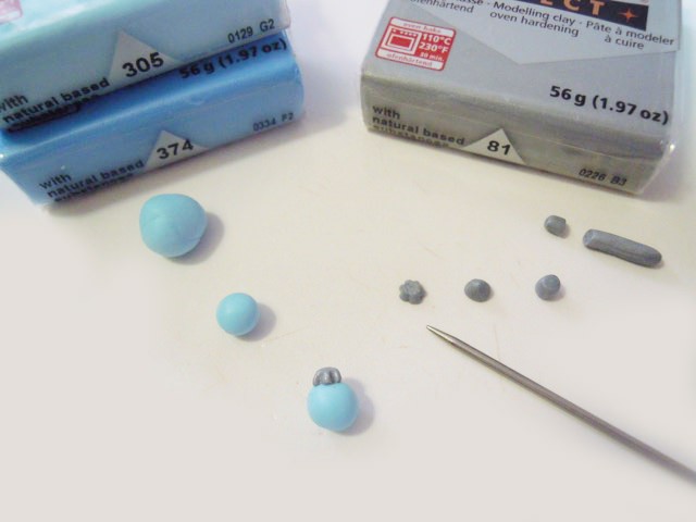 Pour les boules de Noël, faites des boules de fimo bleue et poser dessus un petit cercle rayé en fimo argent.
