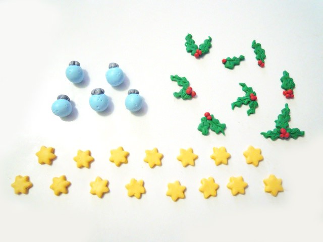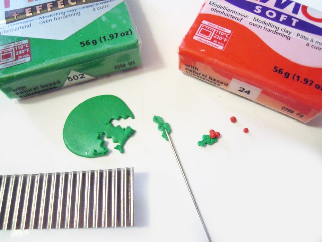 Pour le houx, étalez du vert et découpez des feuilles avec la lame zigzag et ajoutez de petites boules de rouge indien.