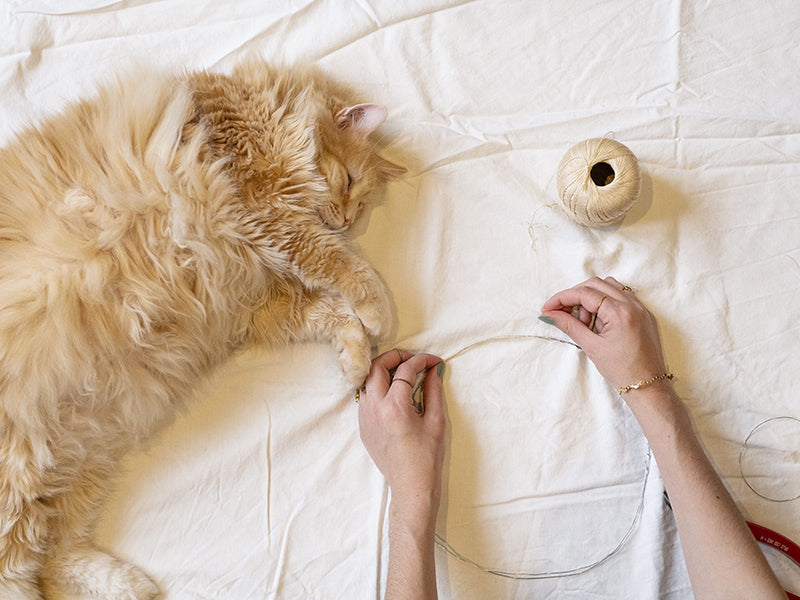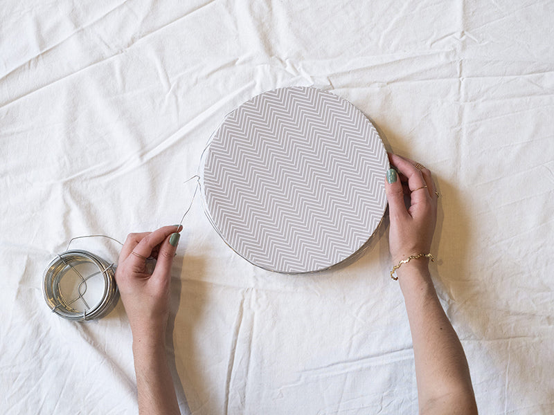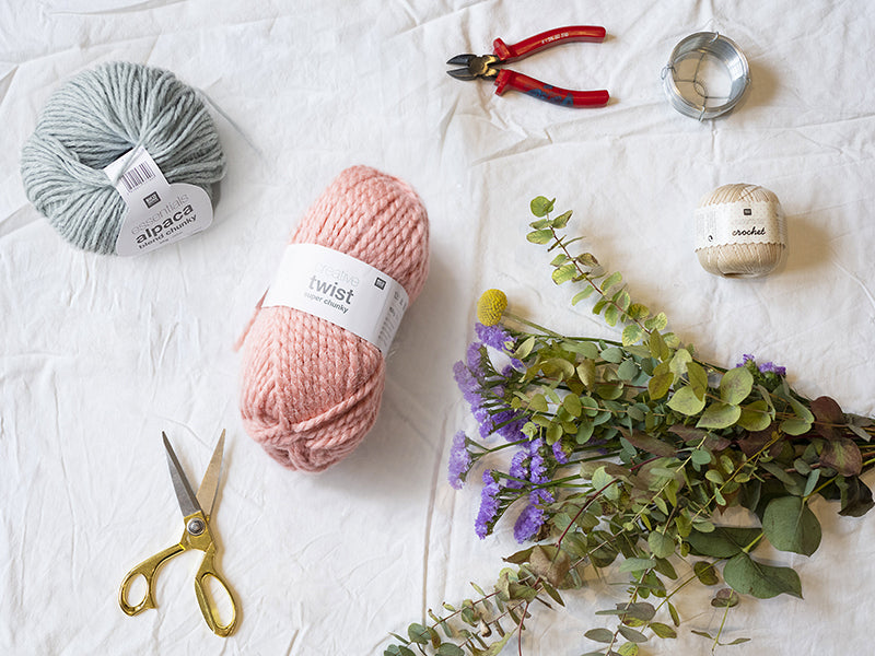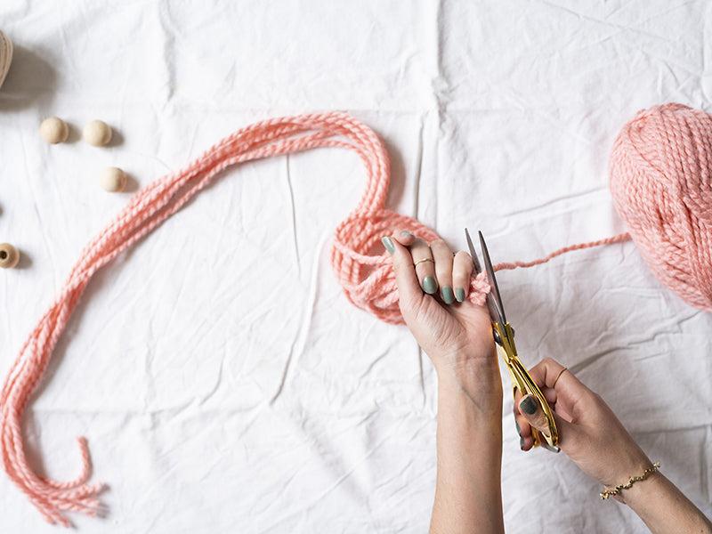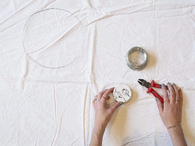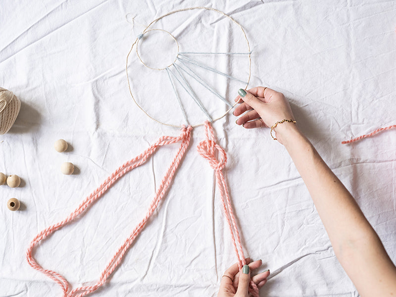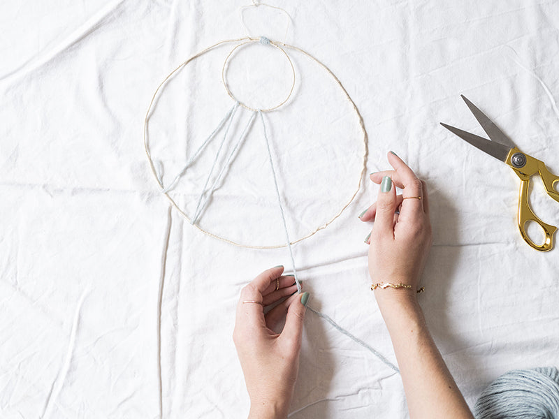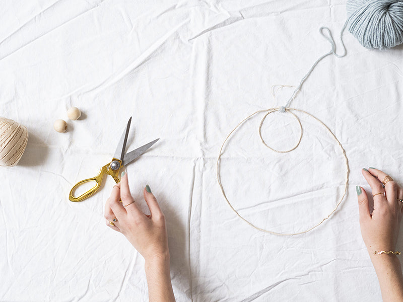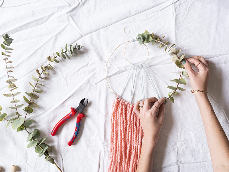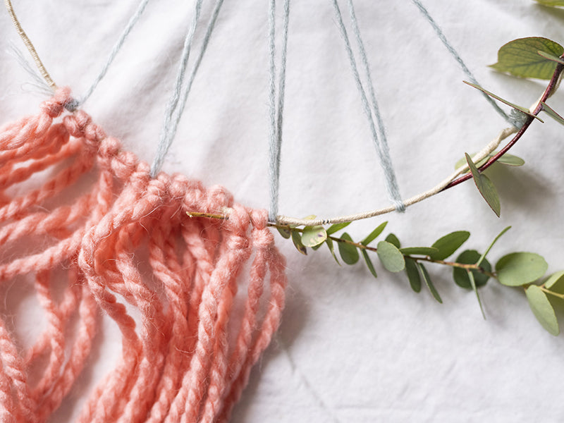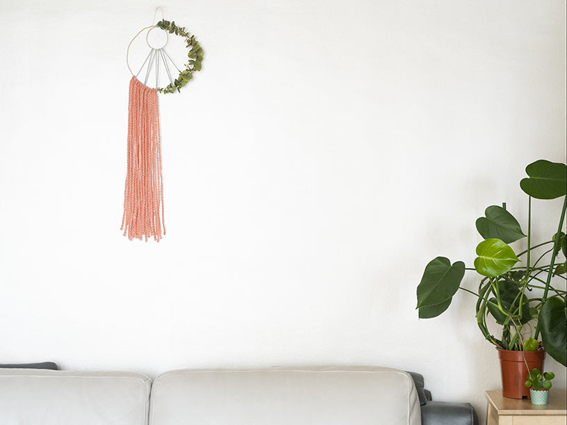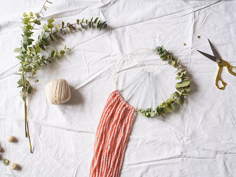 Une fois les franges accrochées, égalisez leurs longueurs puis choisissez vos branches d’eucalyptus, grandes de préférence. Enroulez-les autour de votre cercle : un fois au dessus, une fois au dessus. Servez-vous des feuilles pour camoufler la tige.