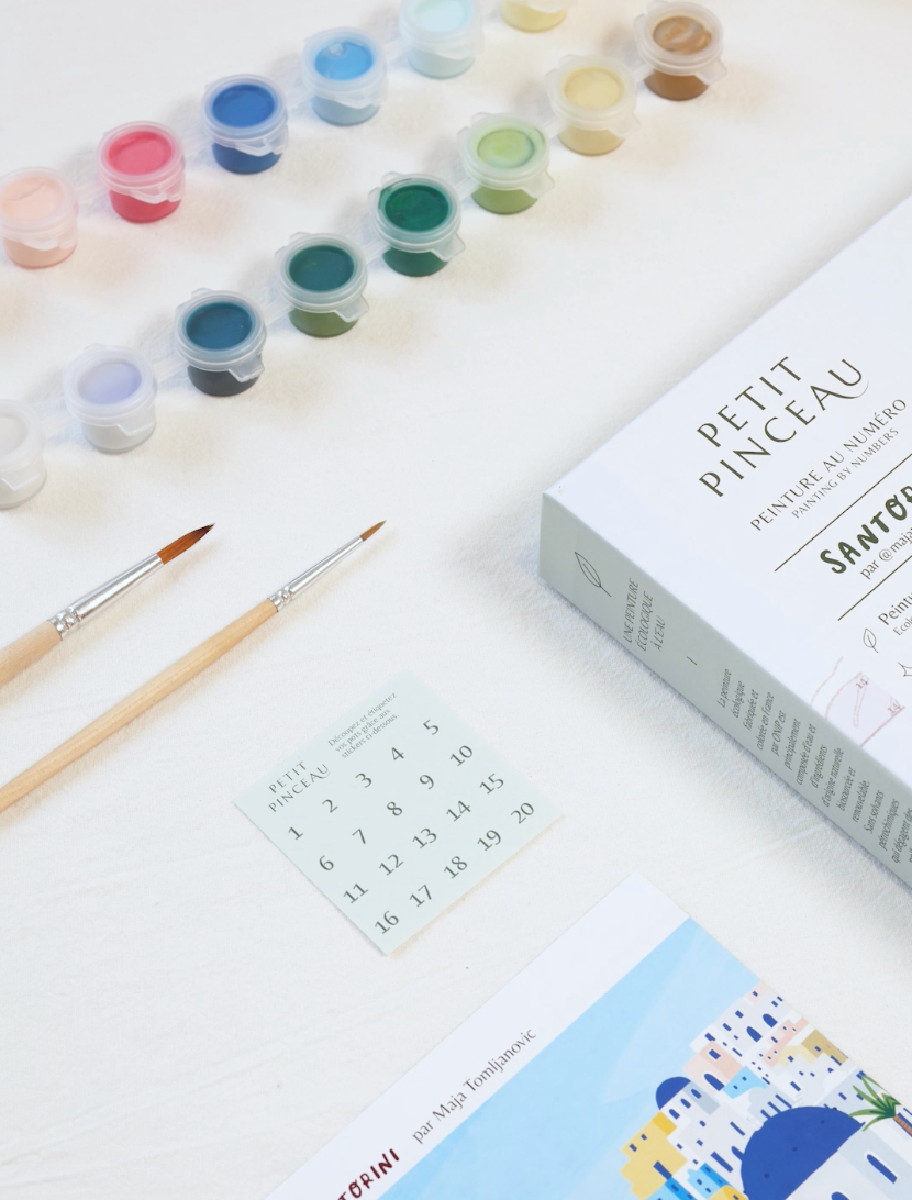 La Petite Épicerie a imaginé spécialement pour vous une jolie série de peinture au numéro, Petit pinceau. Elle vous propose cette peinture Santorini, conçue par l'illustratrice Maja Tomljanovic. Le coffret est 100% Made in France. A vos pinceaux !