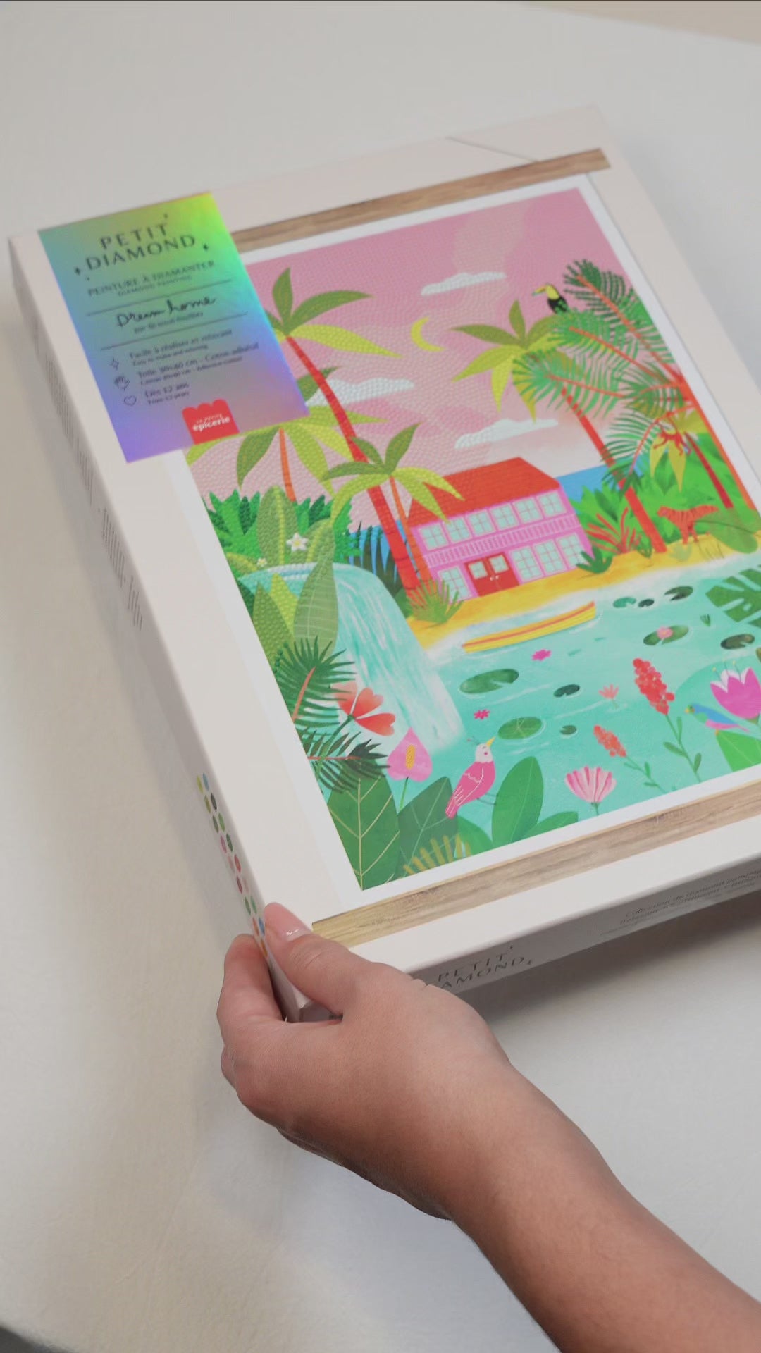 Le Coffret Petit Diamond - Dream Home, imaginé par Laura Lhuillier pour La Petite Épicerie, nous transporte dans un univers coloré et apaisant, entre rêve et réalité. Ce tableau représente une maison tropicale idyllique, entourée d’une végétation luxuriante, d’un petit étang paisible et d’animaux exotiques. Une invitation à la détente, à la douceur et à l’évasion.