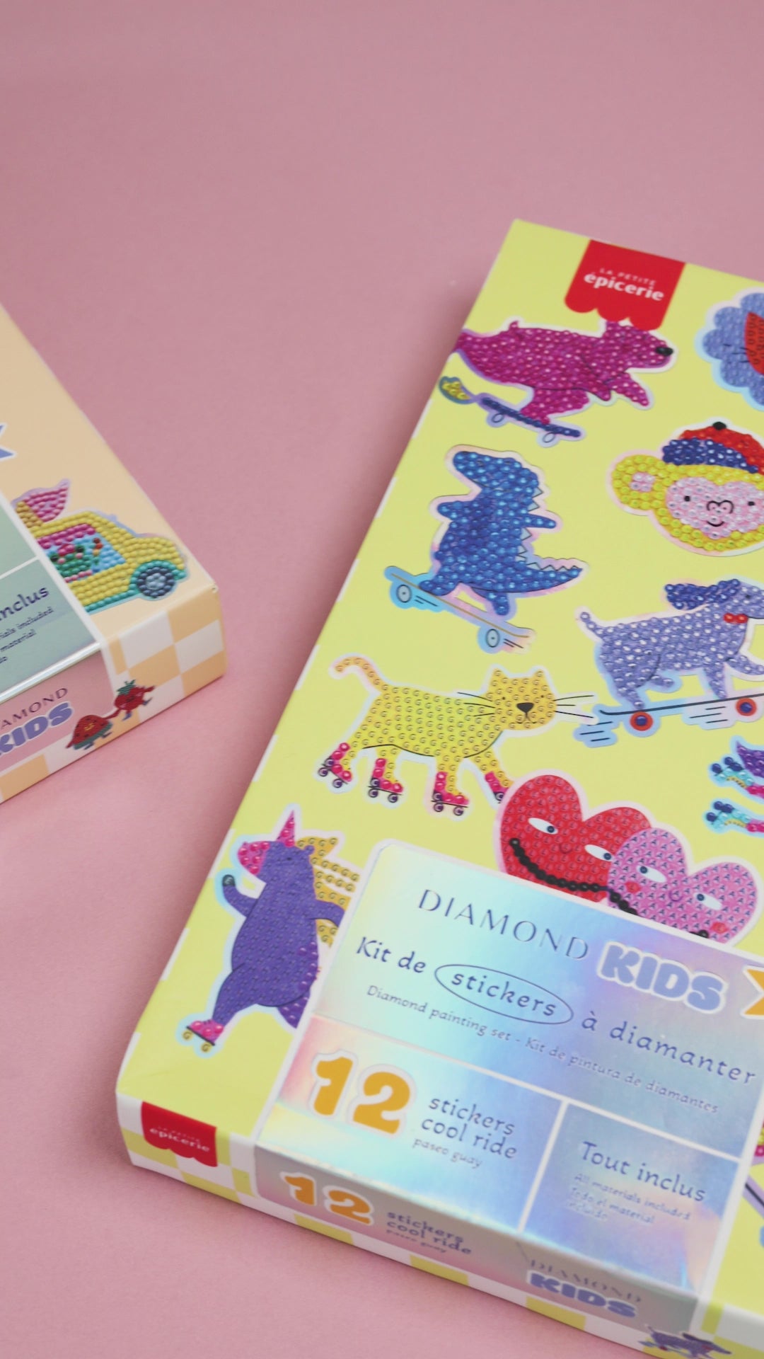 Personnalisez cahiers, cartes et accessoires avec 12 stickers “Cool Ride” à diamanter. Les enfants suivent le code couleur et voient leur création prendre vie avec un effet scintillant bluffant.