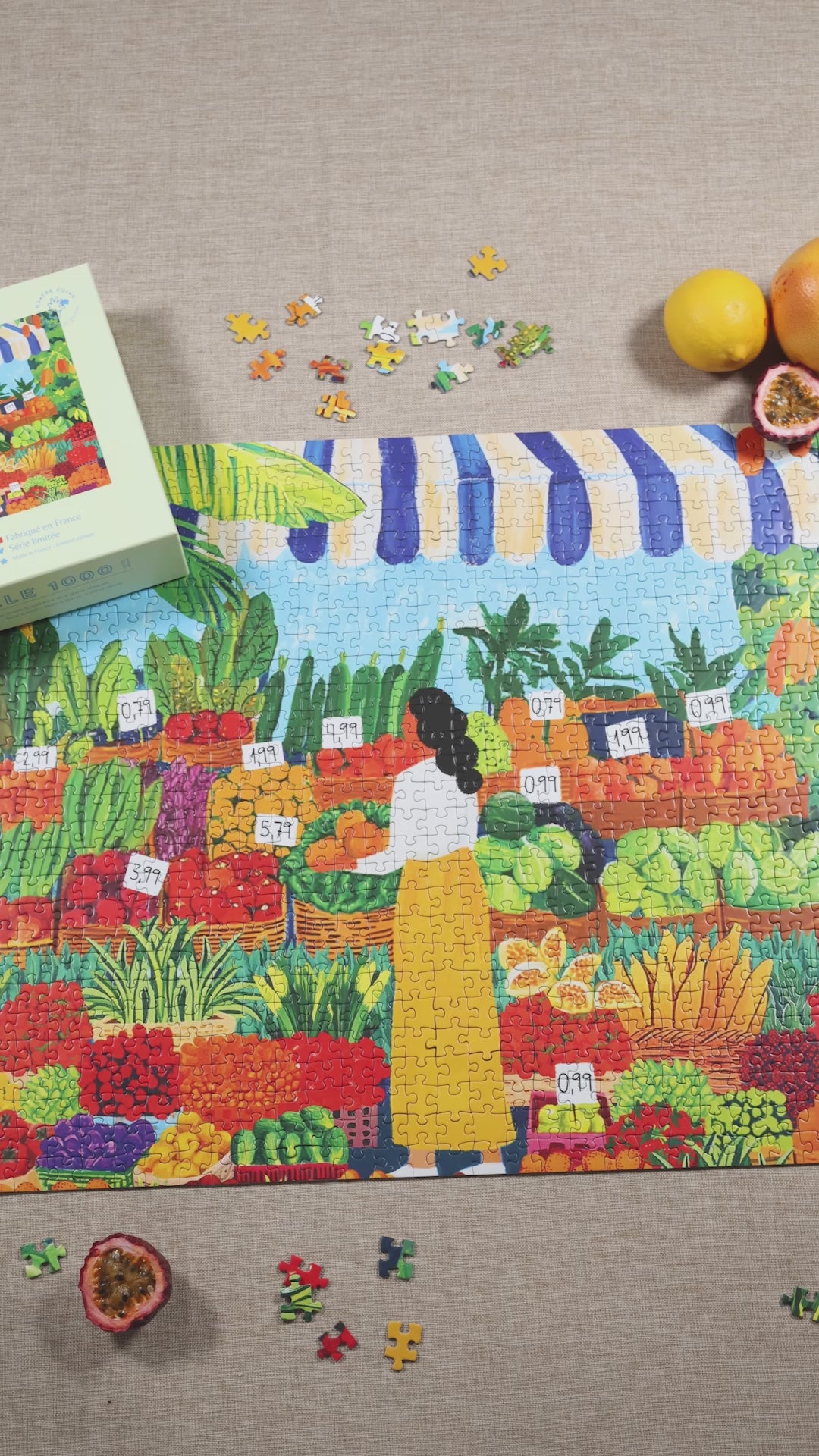 Flânez au marché coloré avec le puzzle Fruit Market par Studio Grand-Père. Un univers ensoleillé à reconstituer en 1000 pièces, 100 % fabriqué en France.